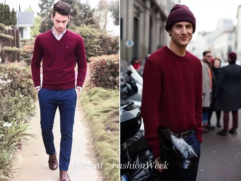 总会有些男士不能接受闷骚的红色,其实这个勃艮第红算是比较低调的,所以不想大面积穿红色的话,可以在打底衫穿这个颜色,加个灰色或深色的外套就OK。