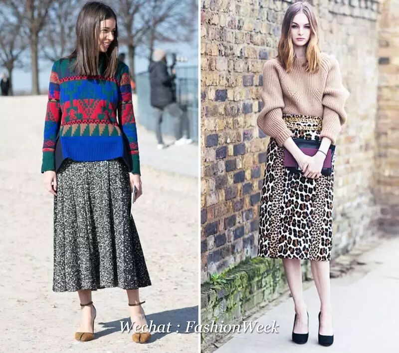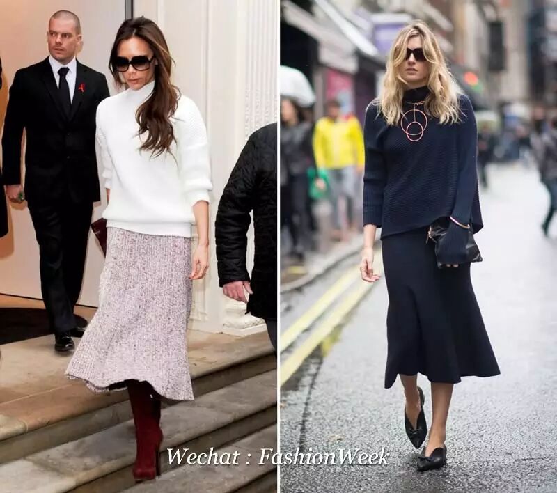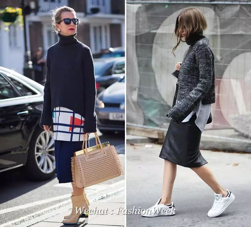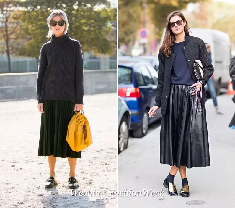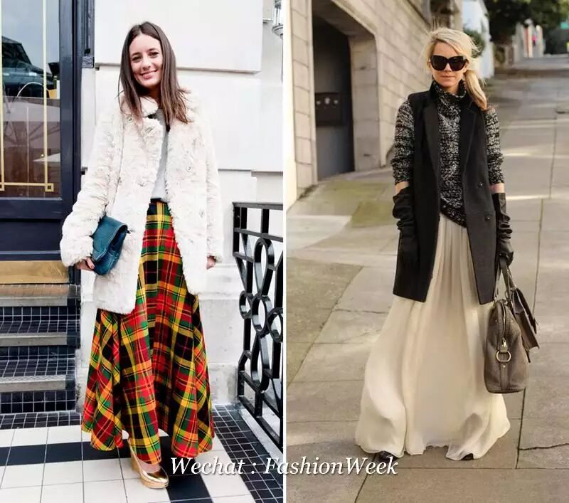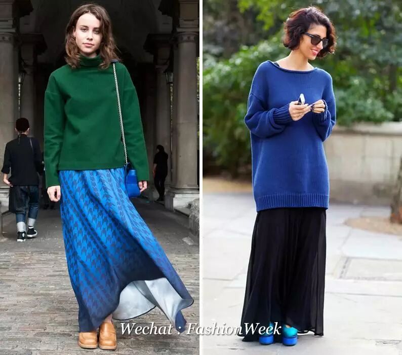 裙装方面,怕冷的妹子首选的就是及地长裙了。墨绿色的半高领毛衣,渐变色千鸟格长裙和棕黄色的方头乐福鞋搭配,肩背蓝色链条包。或者怕绿色难穿的就用蓝色毛衣搭配黑色长裙。满大街都穿得灰不溜秋,你来一抹蓝和绿就特别醒神了。