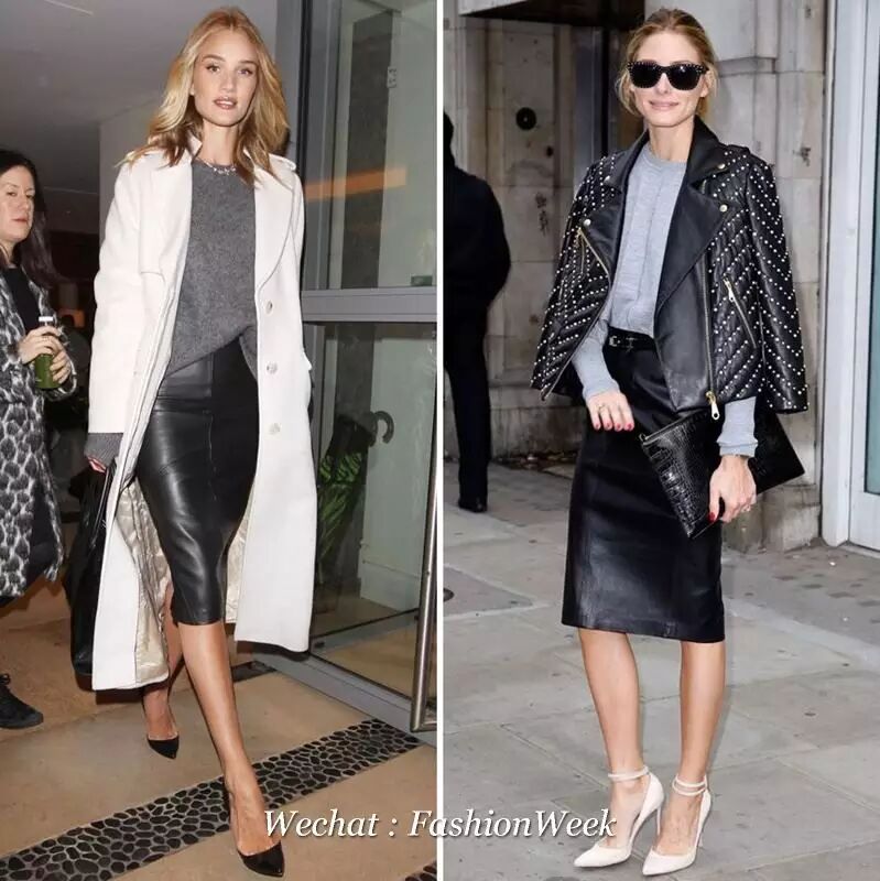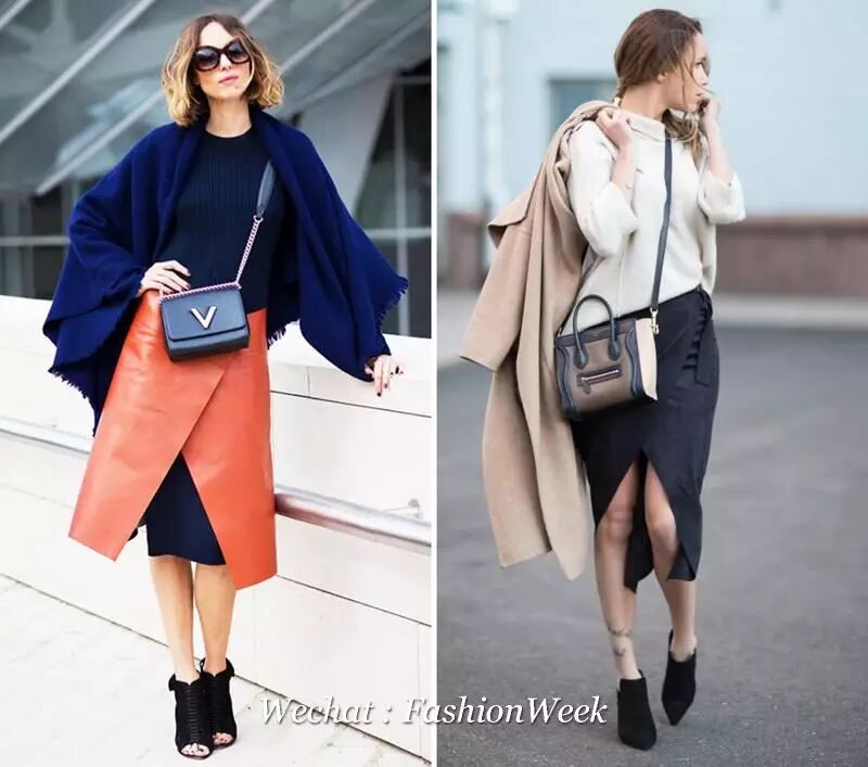 开叉裙的性感真是再冷也抗拒不了。如果是质感硬挺的皮裙,你还可以这样穿一条连身裙在里面打底,搭件大气的披肩,这样再冷也没在怕了。或者开叉幅度较小,羊绒大衣随身带。