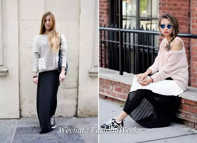 白色和似有若无的裸色最适合配黑裙了,因为面料柔软又有垂感,走起路来都会随风飘荡。想整体感觉随性点就抛弃累人的高跟鞋,换双休闲运动鞋吧。