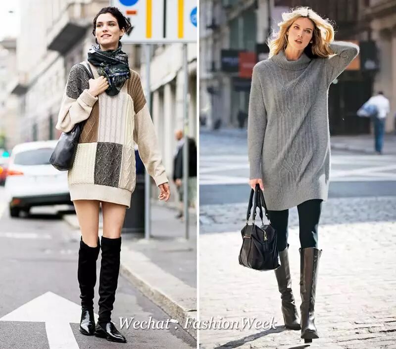 想穿one piece毛衣裙,出动这两样耐寒神器就够了:膝上袜和长筒靴,还是怕冷的就用贴在足底的暖宝宝,双重保险。如果非要穿裤子也可以穿修身的黑色小脚裤。