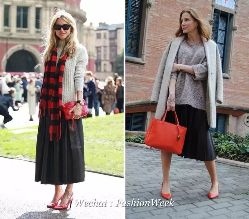不同材质,长度和剪裁的黑色褶皱裙总能带来不一样的惊喜,死寂的冬日里要拿几样红色单品做搭配就能摆脱这种气氛,比如小红鞋和红色包包,最好两者的面料和呈现出来的效果保持一致,即都是亮面或哑光。