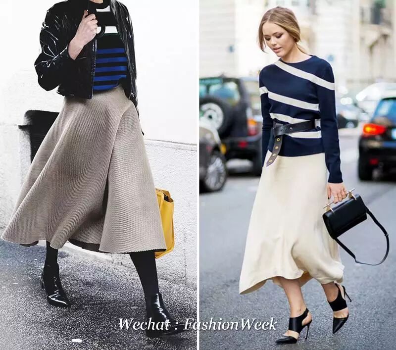清一色的单色毛衣有点无聊,不妨试试条纹不那么规则的圆领毛衣,最多见的是蓝黑还有蓝白相间,搭配小方跟、穆勒鞋都很有味道。