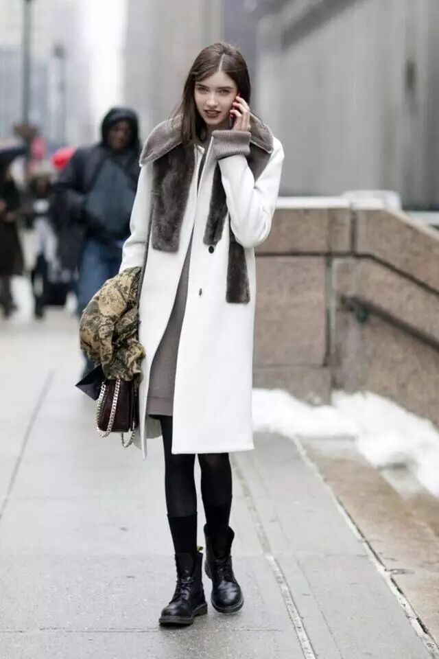 白色的大衣在冬天穿非常纯洁干净哦,搭配黑色丝袜和短靴,叠穿黑色长袜,保暖又很有层次感哦。