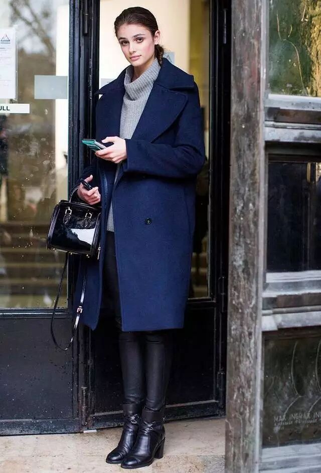 海军色大衣内搭灰色高领毛衣,下搭黑色皮裤和黑色短靴,潮味十足。