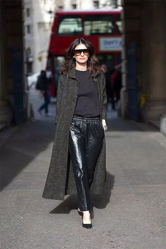 深灰色长大衣内搭灰色T恤,如果腿型不好的话,选择直筒皮裤也是可以的,脚踩黑色高跟鞋,时髦极了。