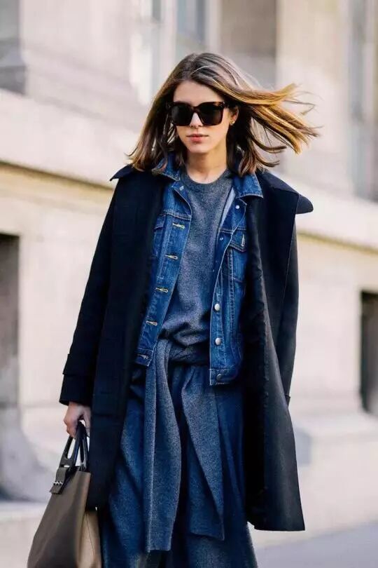 如果你想要将外套叠着穿的话,不如这样来穿吧!毛衣长裙搭配牛仔外套,外搭长大衣,腰间再系毛衫,很有层次感哦。