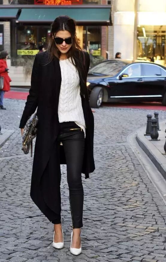 黑色长大衣内搭白色毛衣,穿黑色皮裤,脚踩白色高跟鞋,很知性又有女人味哦。
