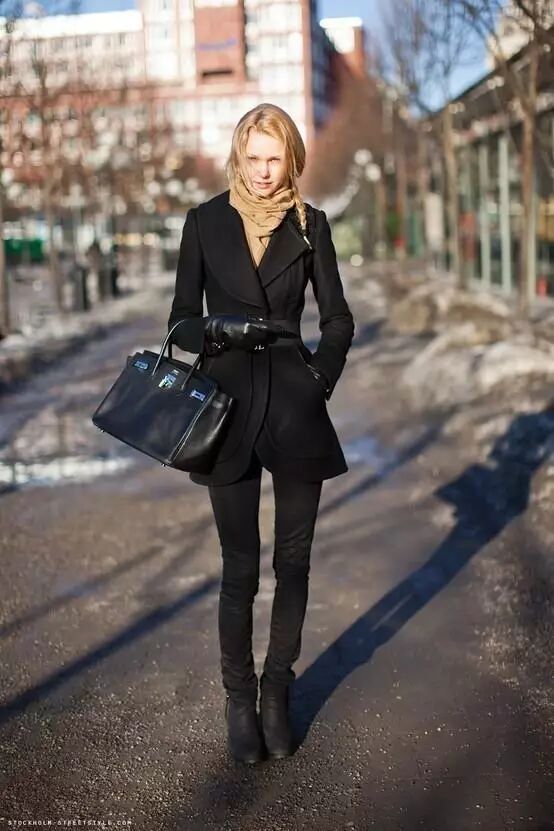 全身黑的装扮,用驼色的围巾点缀整体,很吸睛哦。